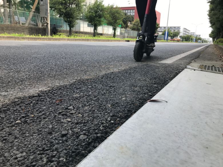 電動キックボードは道路の左側を走行するわけだが、まず実感するのは路側帯付近は想像以上に凹凸が激しいということ。