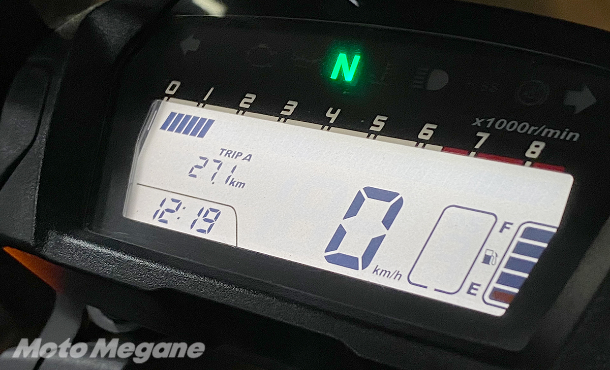 現行バイクは燃料計が装備された車種が多い。この「HONDA NC750X」もメーター右端に燃料計が装備されており、タンク残量を5段階の目盛りで表示してくれる。ガソリン残量が少なくなり最後の目盛りになると表示が赤くなり点滅して警告してくれる。