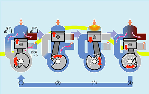 イラストからわかるとおり、2ストエンジンは4ストと違って掃気(吸気)/排気ポートをピストンが通過する構造になっている。そのためピストンに横方向の力が加わりやすく、いわゆる「首振り」現象が起こりやすい。