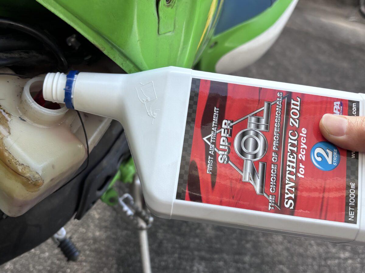 今回使用する製品は、ベースオイルに高性能100%化学合成油を使用した赤いラベルの「シンセティックゾイル for 2cycle」だ。
