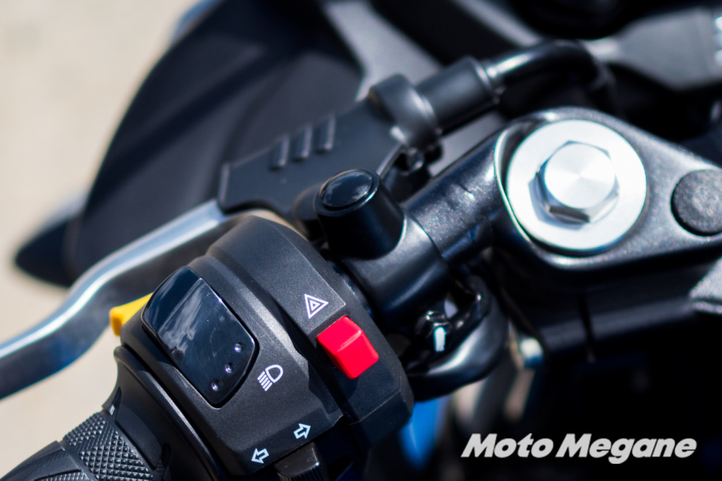 ハンドルはセパレートハンドルだがトップブリッジ上にマウントされているので前傾は緩め、ストリートファイター系バイクと大きくポジションは変わらない。