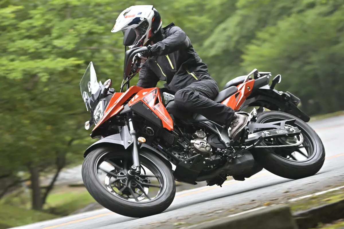 車両の押し引きではハンドル操作に粘りを感じたが、微速でも前進していれば、ハンドル操作はスムーズに行なえる。コーナーへの進入時には少し立ちの強さを感じるが、車体の倒し込みとハンドル操作に粘りはなく、Vストローム250SXも狙ったラインでのスムーズなコーナリングが決まる。連続コーナーでの車体の切り返しでも車重を感じず、大径化した前輪のデメリットはほとんど感じなかった。