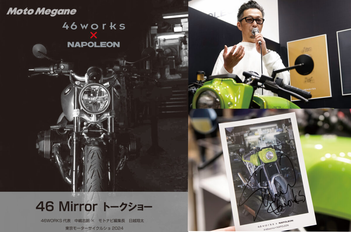 自らもレースに参戦するなど走りを一番に考えた機能美溢れるカスタムで愛される、カスタムバイクビルダーの中嶋志朗氏が代表を務める46ワークスとタナックスのナポレオンミラーとのコラボ製品が登場。