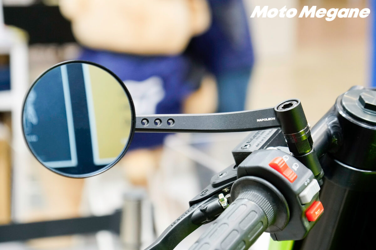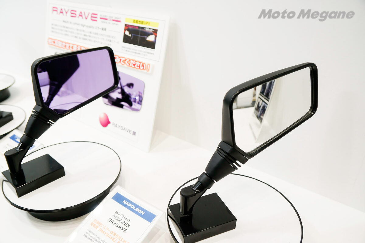(右)ナポレオンハンドルマウントミラーではターナー機構を損なわず駐車時のミラーの折りたたみにも対応した新作も展示。