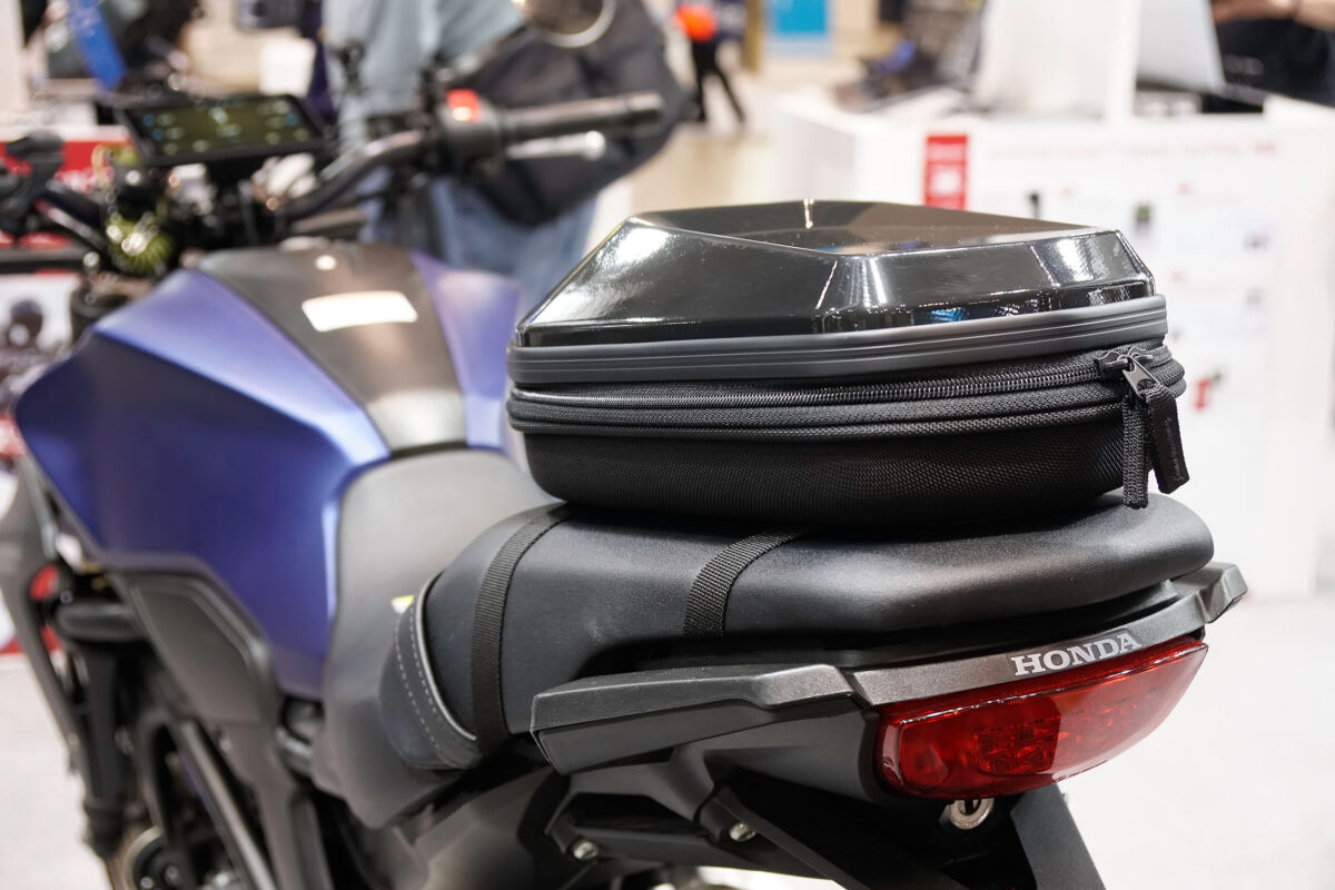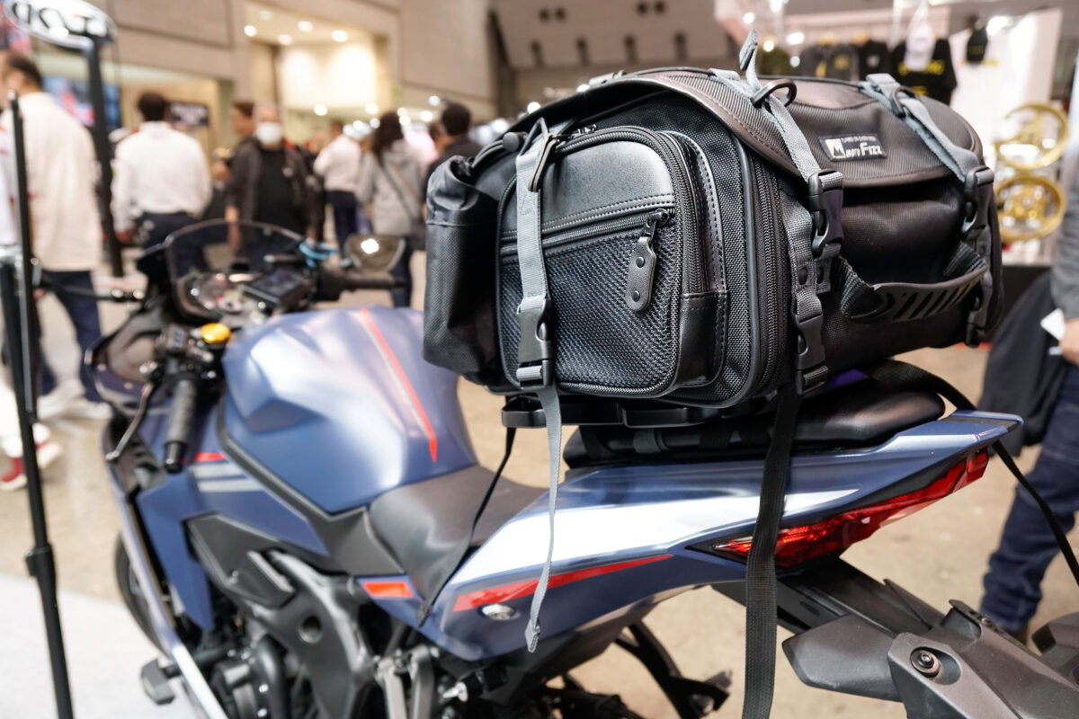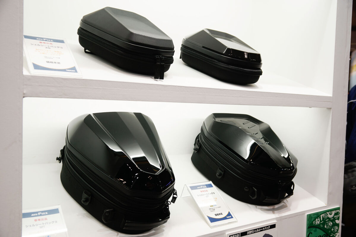 motoFizzブランドから、防犯/防水/確実な取り付けという3つの安心を掲げて次世代のシェルシートバッグとして登場。日帰り〜1泊サイズのシートバッグ(下段)と取り付けベルト一体型のショートツーリング向け小型シートバッグ(上段)が展示されていた。価格は未定。