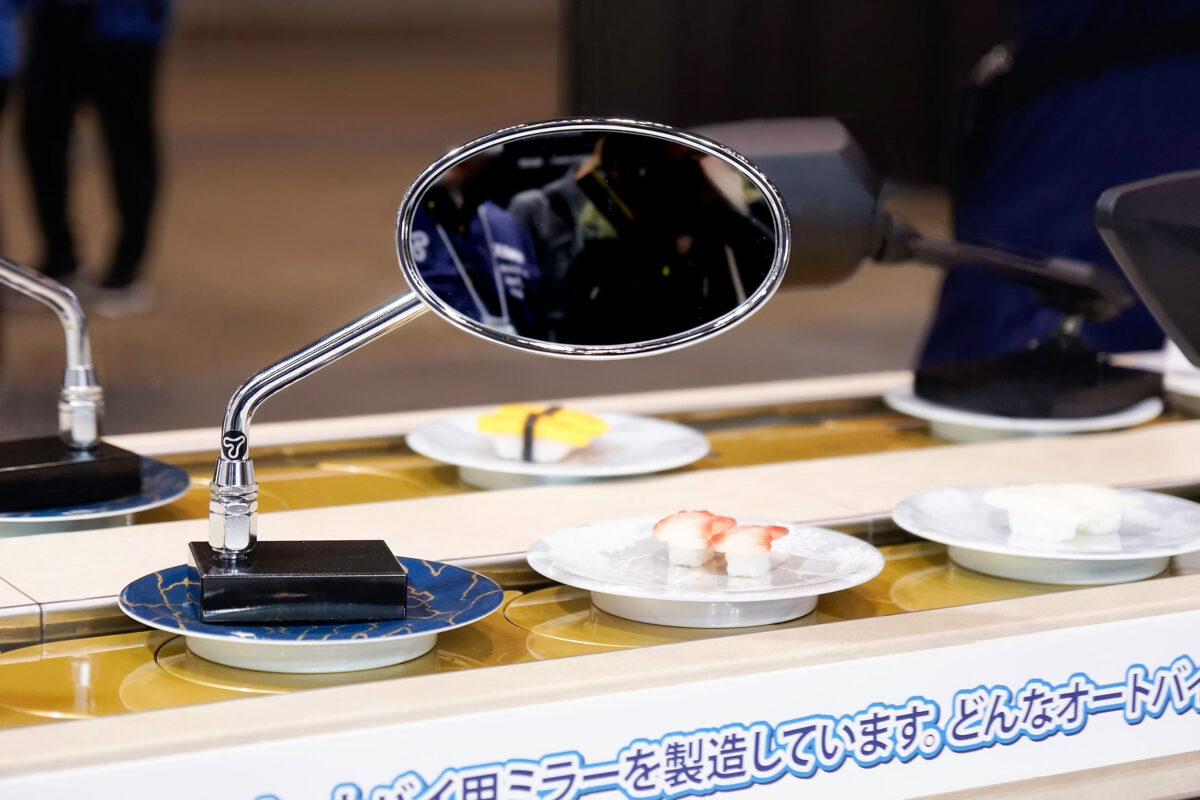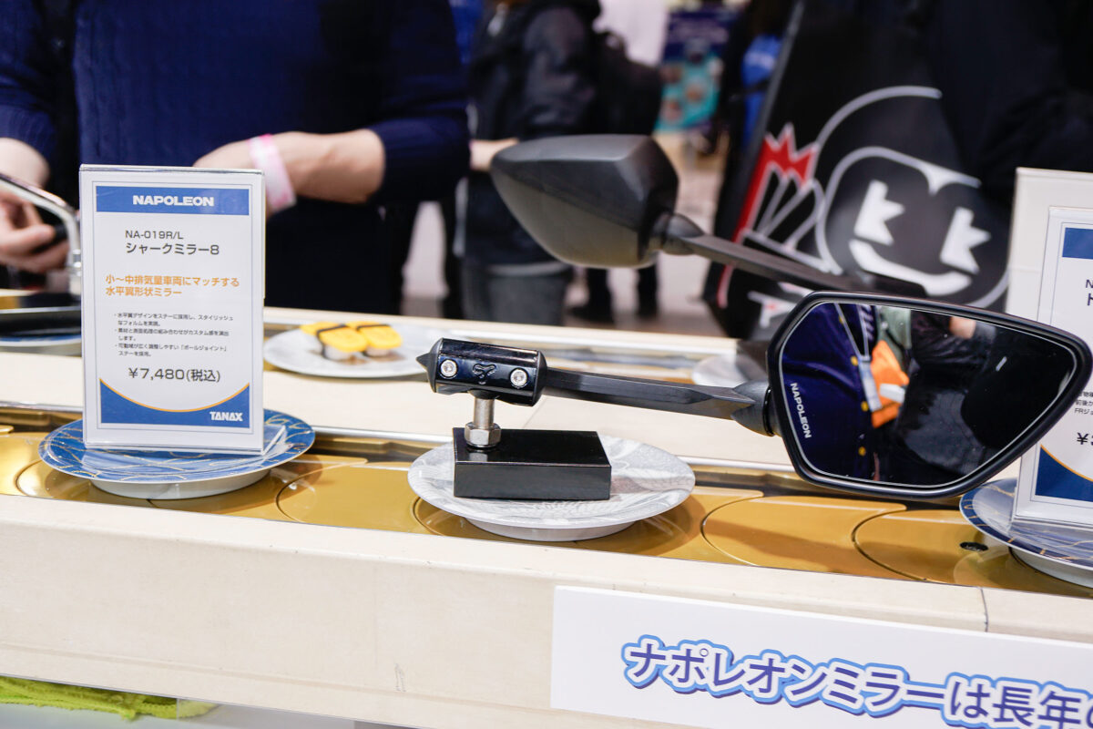 また、クスリと笑わせてくれたのが、洗練されたデザインと機能性を両立するNAPOLEONミラーブランドの展示。回転寿司に見立てた展示はNAPOLEONミラーの持つ汎用性を表現し、流れてくる各種ミラーから愛車に合う好みのネタ(ミラー)を選んじゃおうというもの。