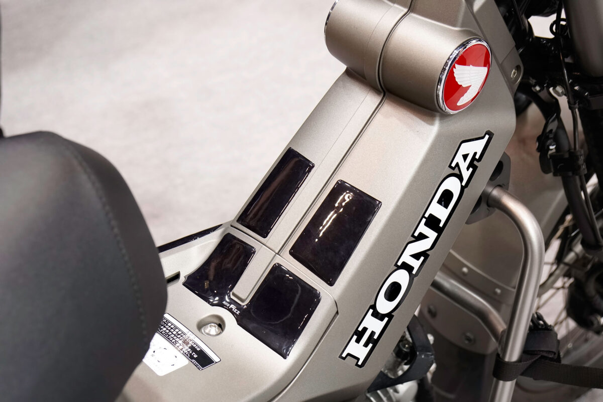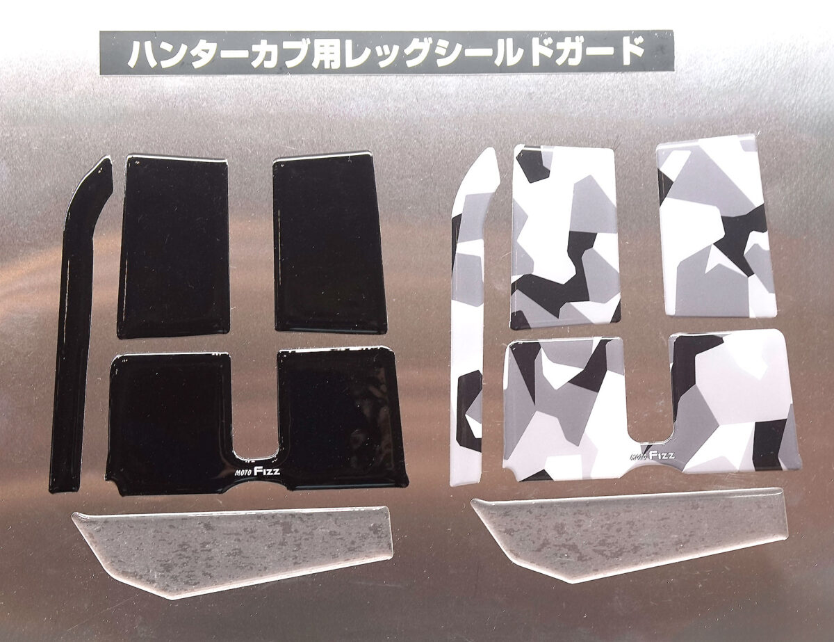 ハンターカブ用のレッグシールドガードを実際に装着したハンターカブが展示されていた。擦り傷がつきやすいポイントがしっかりとオシャレにカバーされており好印象。