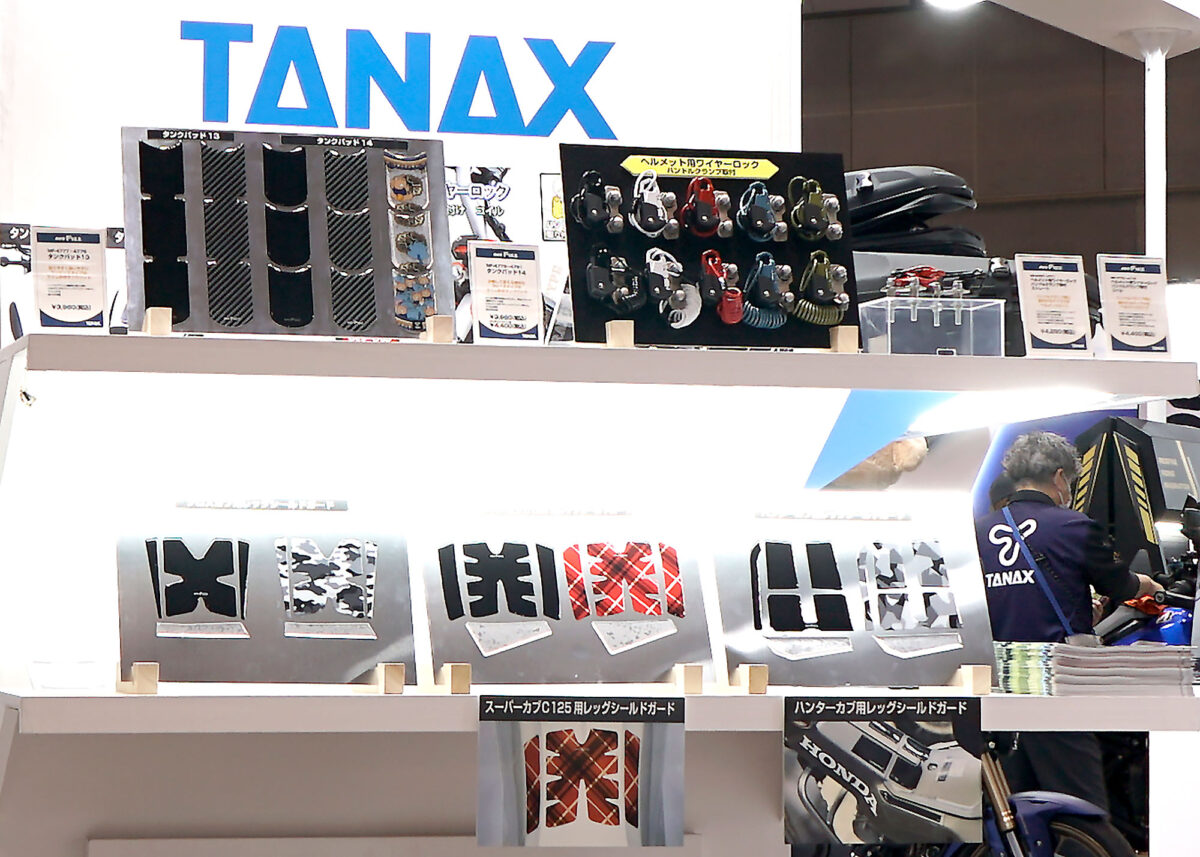 スーパーカブC125用/クロスカブ用のラインナップもあり、かわいいチェック柄や迷彩柄なども来場客の視線を集めていた。