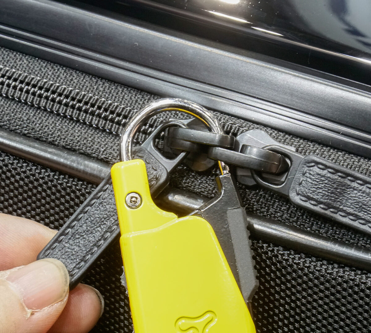 YKK製タフジッパーのファスナーのロック穴に通して施錠できる。3桁ダイヤルロック式。