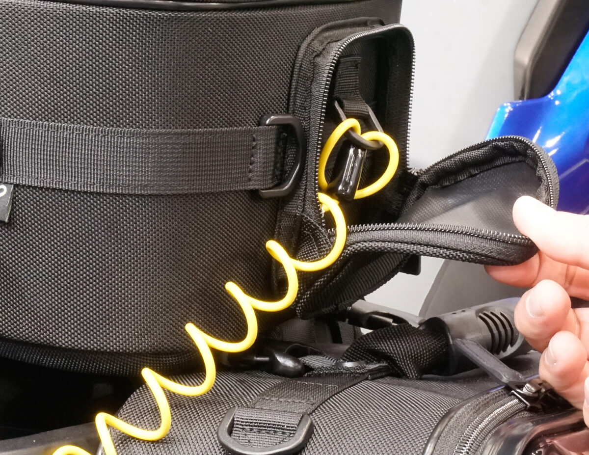モトフィズのワイヤーロックはバッグのYKK製タフジッパーのファスナーのロック穴に対応しており、休憩時などバッグ装着状態のままでバイクから離れる場合でもバッグの中身をしっかりと守ってくれる。また、グラブバーやフレームにワイヤーを通すことで、バッグごと盗まれる心配も軽減する。