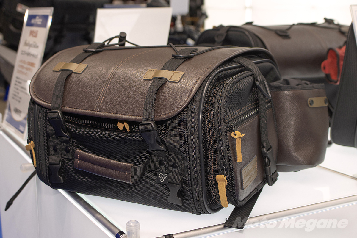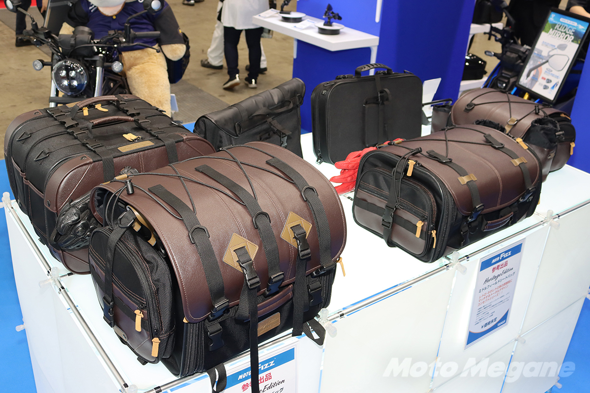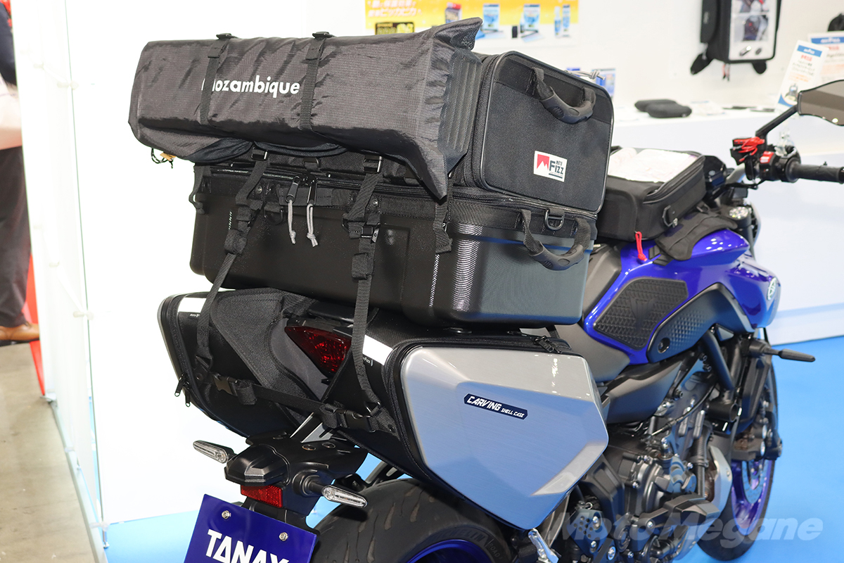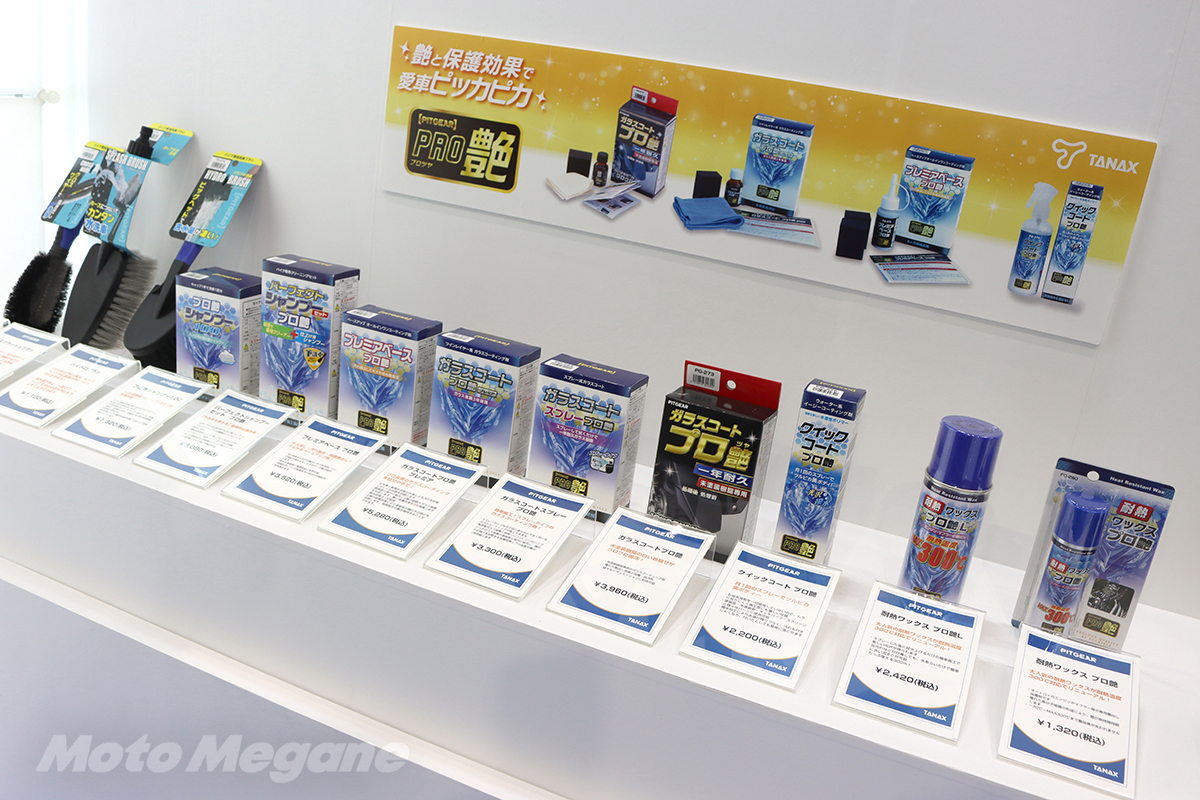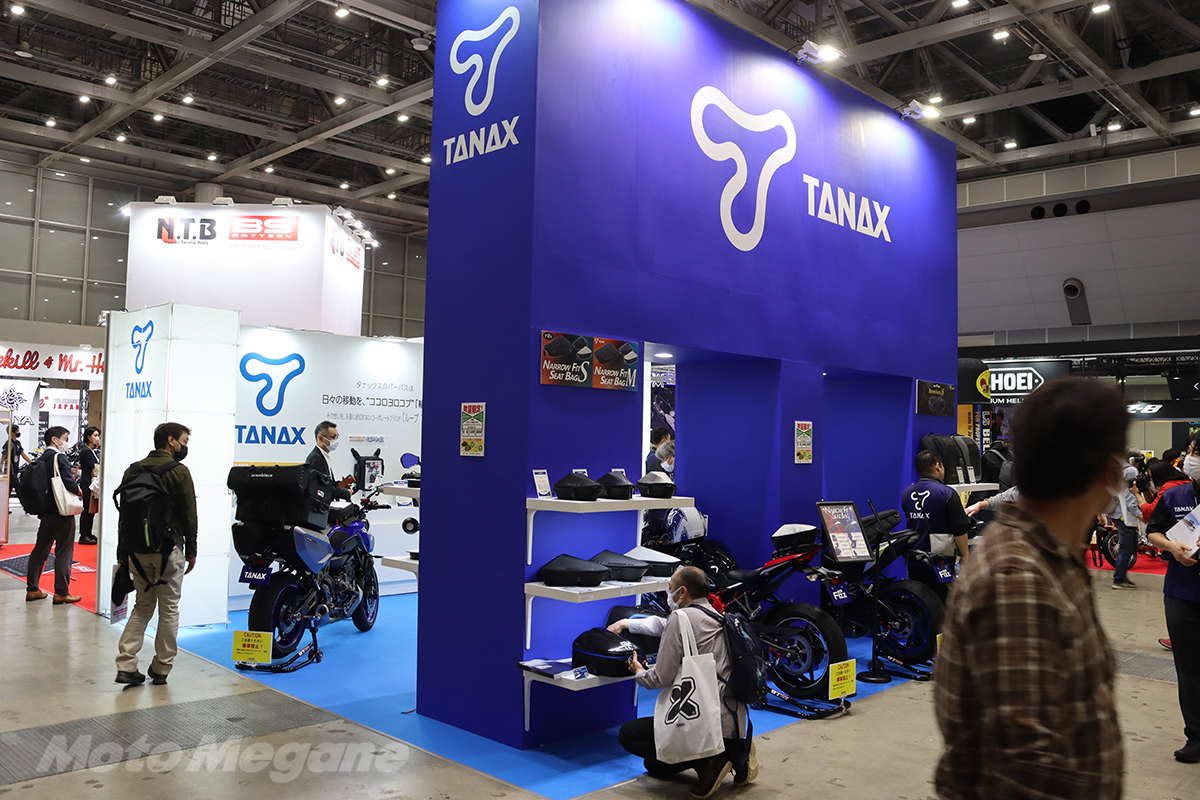 ツーリング向けのバッグを中心に、ミラーやメンテナンスアイテムなど、ライダーにとって欠かせないアイテムを揃えるTANAXブース。今回展示された参考出品アイテムはほぼ、今年の発売が予定されている。