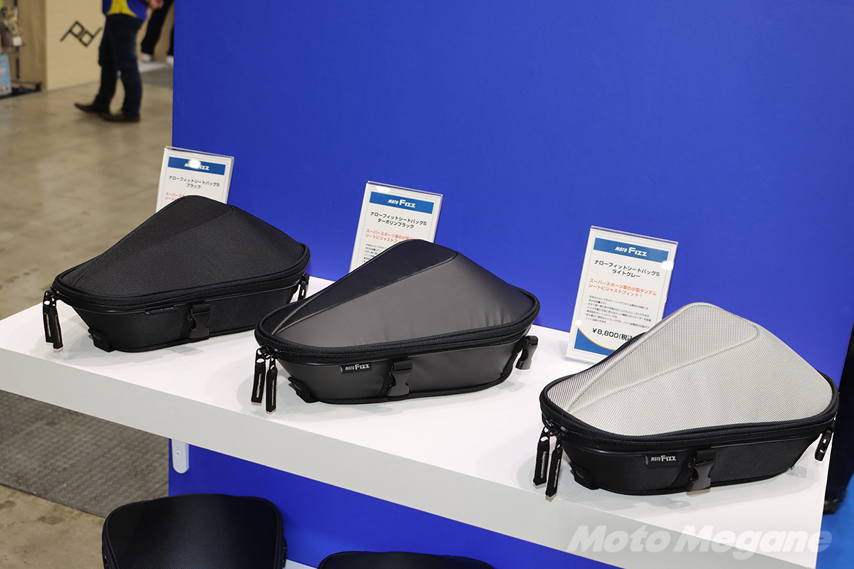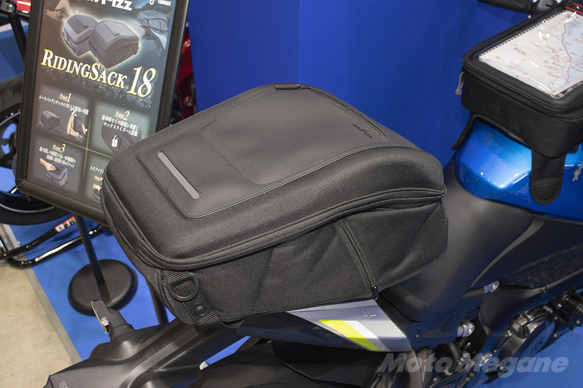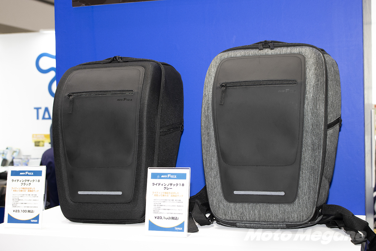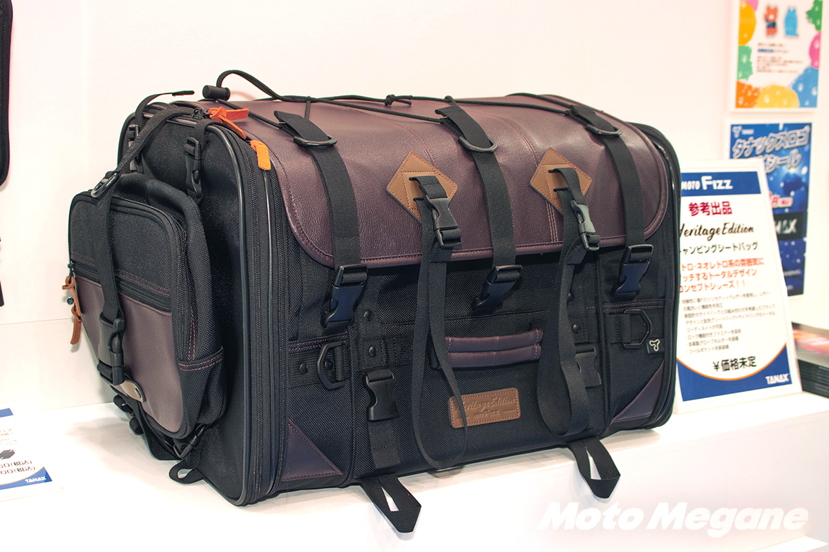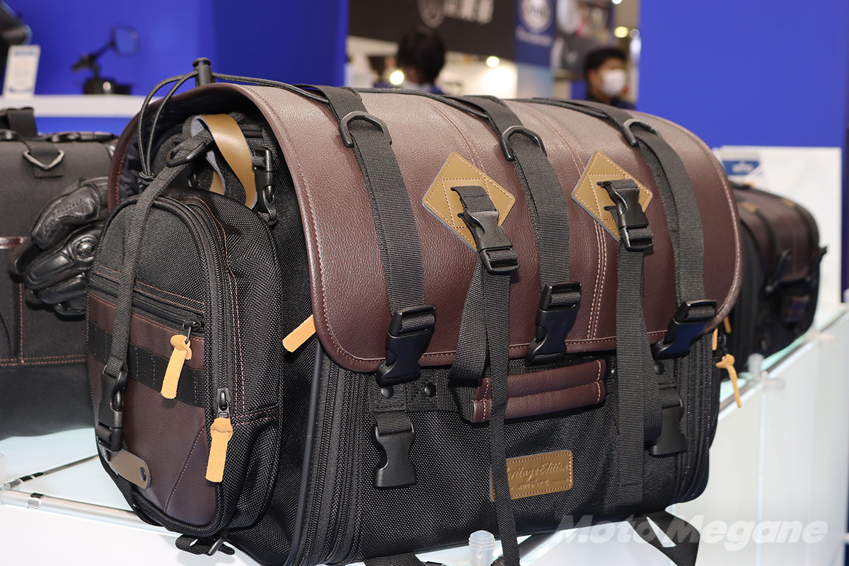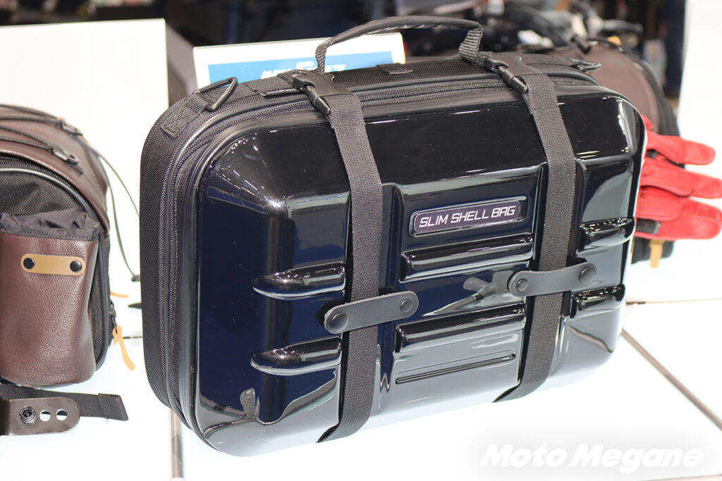 ツーリング向けのバッグを中心に、ミラーやメンテナンスアイテムなど、ライダーにとって欠かせないアイテムを揃えるTANAXブース。今回展示された参考出品アイテムはほぼ、今年の発売が予定されている。
