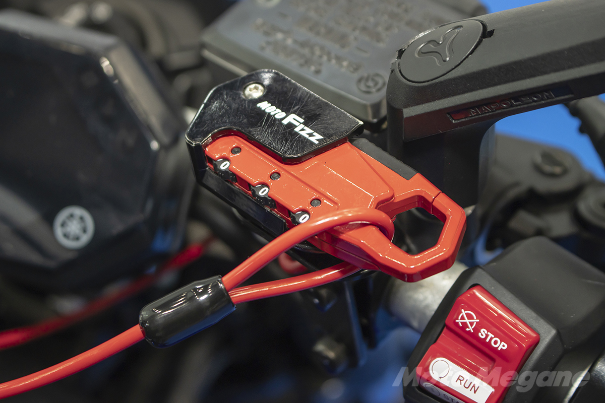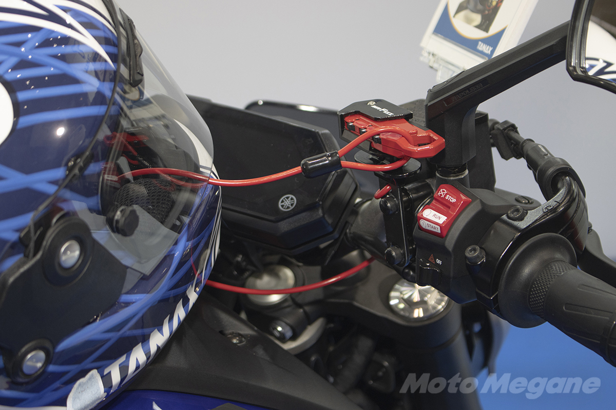 ツーリング先の休憩時にヘルメット置き場に悩むことも多いが、このワイヤーロックならヘルメットを脱いで跨ったままスピーディにロックが可能。発売が待ち遠しいアイテムだ。