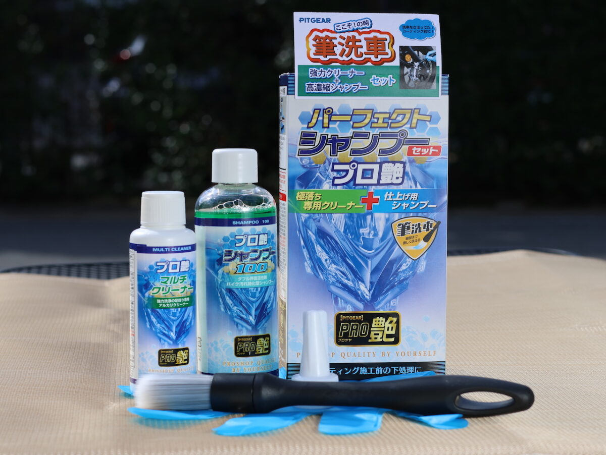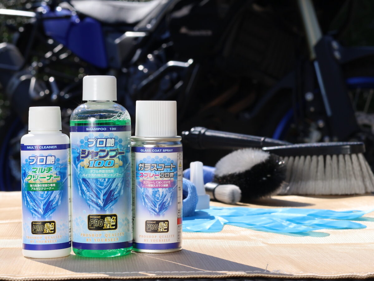最大の特徴はケミカルが1種類ではなく、足回りなどの頑固な汚れ用のアルカリ性クリーナーである「マルチクリーナー プロ艶」と、全体洗い用の「プロ艶シャンプー100」の2つに分かれていること。