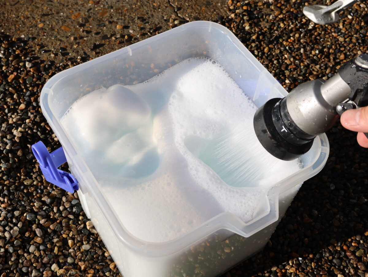 「仕上げ用シャンプー」は、通常洗車ではキャップ1杯に対して1ℓの水で希釈が目安。汚れがひどい場合は、1ℓに対して最大キャップ4杯の割合まで濃度を高めて洗剤の強さを調整する。
