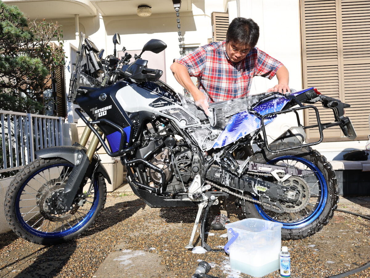 第2段階の全体洗いは、バイクの上側から下へ向かって洗うのがセオリー。ハンドル周り→タンク周辺→シート&テール周り…といったように部位ごとにブラシで擦り、その都度水をかけて洗剤を洗い流す。これはせっかく洗った部分のシャンプーを乾かさないためで、気温や日差しなどの状況に合わせて洗う範囲を調節しよう。