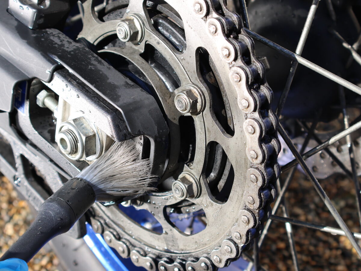 第一段階は、足回りやチェーン、エンジンまわりなど「マルチクリーナー プロ艶」オイルやブレーキダストなどの頑固な汚れを落とすところからスタート。