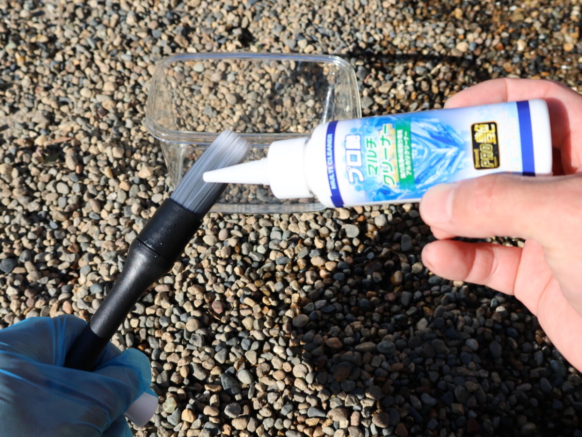 水を吸わせた専用筆ブラシに「マルチクリーナー プロ艶」を原液のまま染み込ませ筆先で汚れを浮かせながらピンポイントで落としていく。ホイールに飛んだチェーン油などはなかなか落ちないものだが、専用クリーナーがあると作業が非常に効率よく行える。