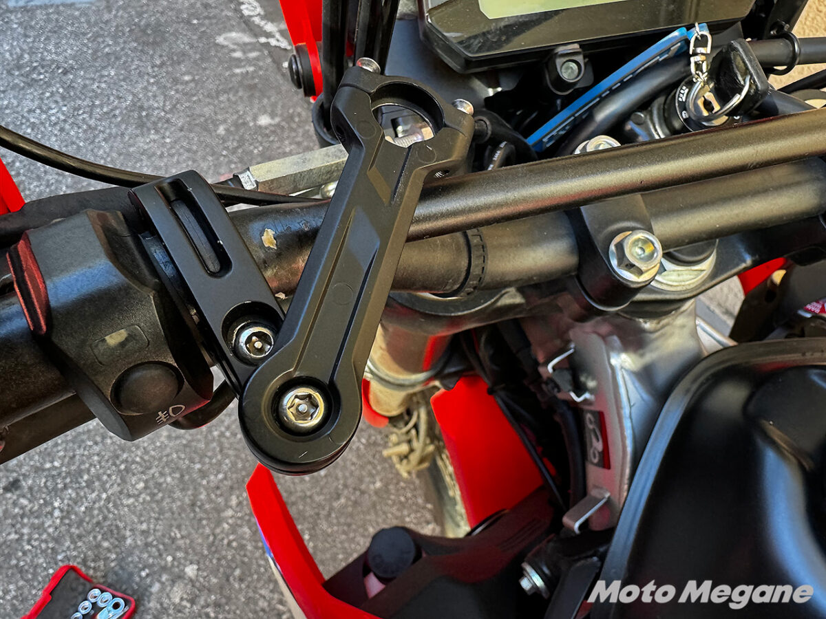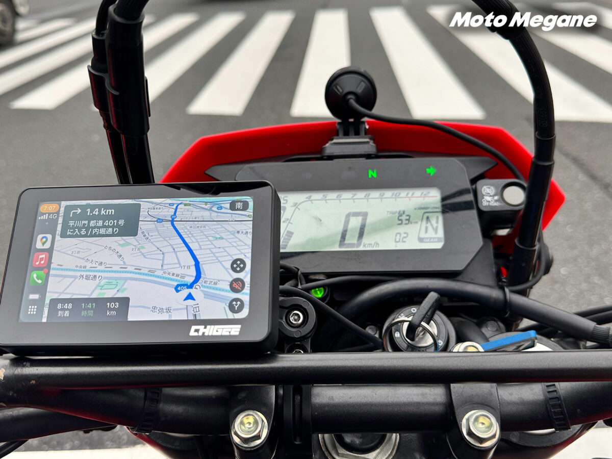 SRS-019は無理なく余裕を持ってハンドルバーより前方に設置でき、メーターもしっかりと確認できるサイズ感だった。普段のスマホマウントよりもハンドルまわりのスッキリ感が上がったので感動した。