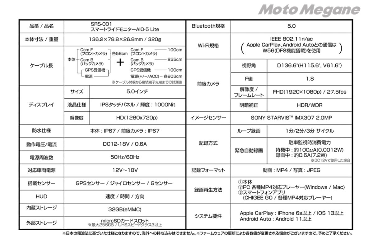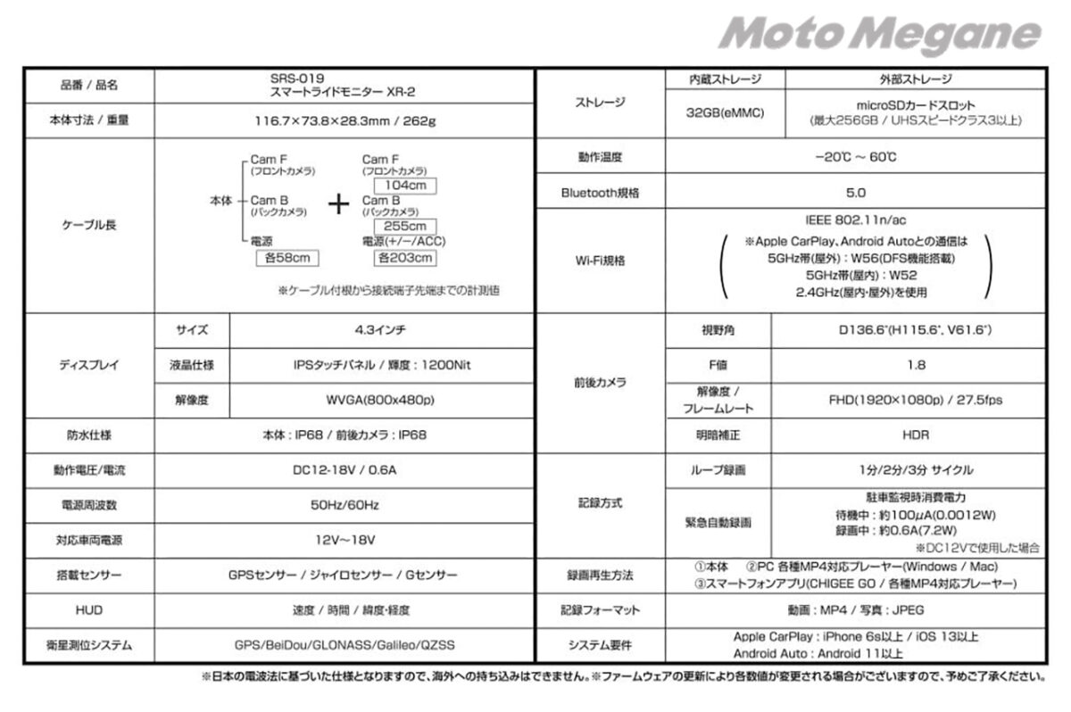●内容:本体、カメラ×2、GPS受信機、電源ケーブル、取り付けステー、取り付けジョイントベース、φ22.2/25.4/28㎜スペーサー、エレクトロタップ×2、結束バンド、取り付け用工具セット ※ハンドルクランプ標準装備