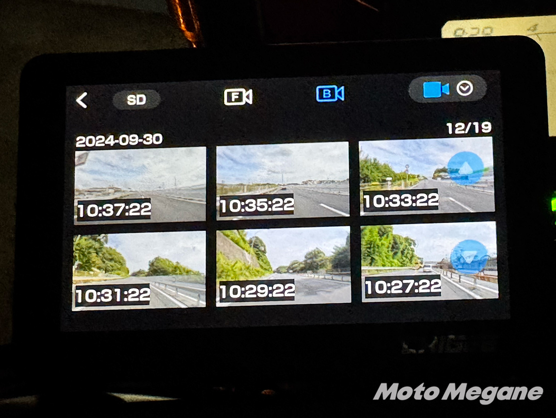 録画したものの確認も簡単。フロントカメラとリヤカメラのどちらの画像を見たいかもすぐ選べる。