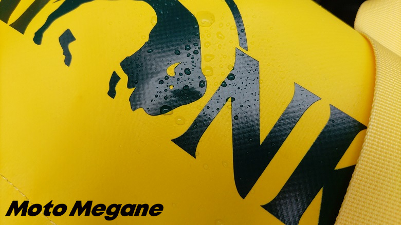 表皮にはターポリン素材を使用しているので、防水および撥水性能は抜群。ツーリング時に降られる多少の雨くらいならば、中の収納物は濡れずに済みそうです。