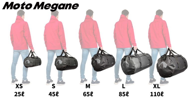 サイズは全部で5種類あり、最大のXLは容量110L、Lでも85Lもあり、遠征ツーリングでの使い勝手を考えれば3~4泊でMサイズ、2~3泊でSサイズ、そして1泊ならXSサイズで十分でしょう。そこで、今回お借りしたM、S、XSの3サイズを背負いながらバイクに乗るとどうなるか、そして荷物はどのくらい入るのか、イメージを以下に載せてみましたのでご覧ください。