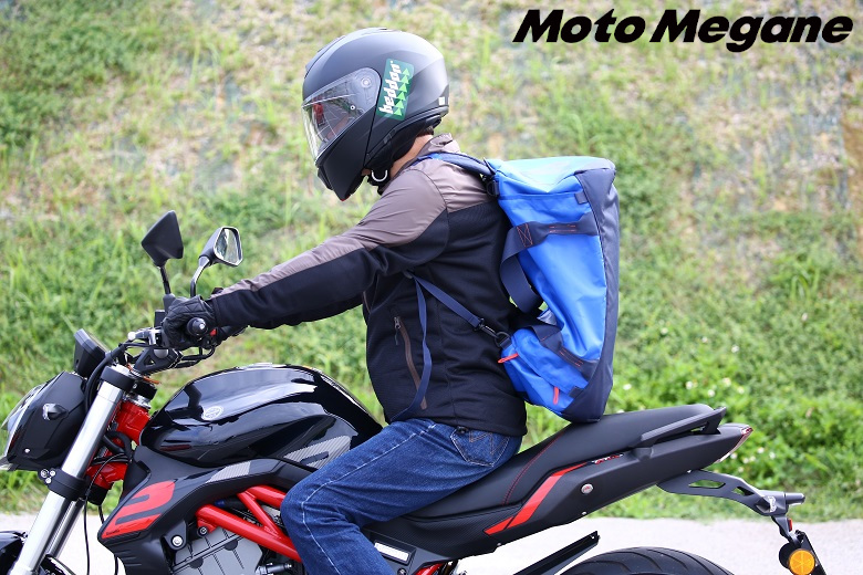 小~中型バイクに乗って背負うことを考えると、このSサイズが一番しっくり来ます。ショルダーストラップを伸ばせばタンデムシートまで着いて重さが緩和されますが、コーナーでは一体感が崩れてしまうのが悩みどころ。ヘルメット1個しか入りそうにありませんが、余ったスペースは十分です