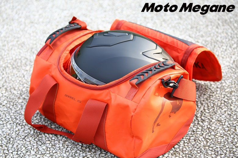 もっともコンパクトなモデルはワンショルダーの肩掛けスタイルなので、コーナー侵入時には遠心力でブラついてしまいそう。サイズ感を考えると、これなら荷掛ロープでタンデムシート上に装着するのがいいかもしれません。ヘルメットを入れてみましたが高さはギリギリ、前後長は多少余裕があります。