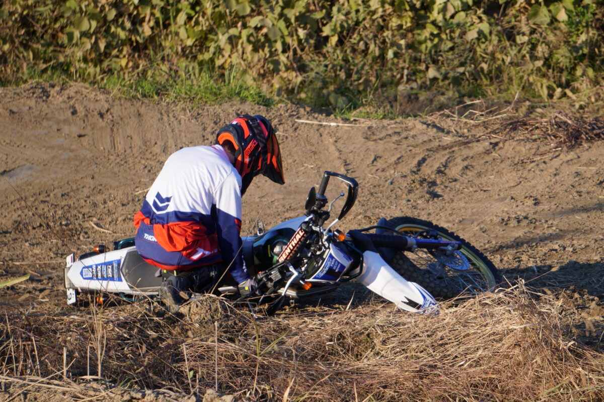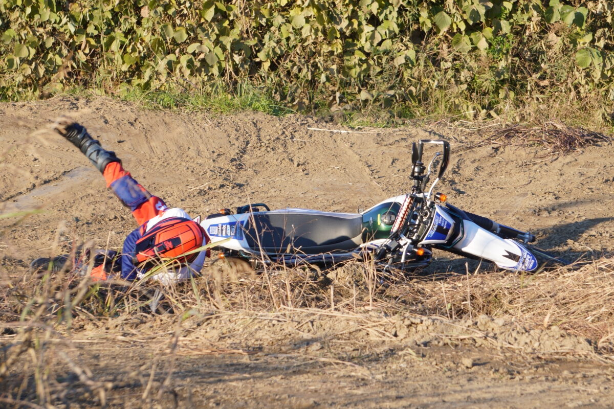 アスファルトと違ってバイクに傷はつきにくいですが、倒れたバイクを起こす動作は体力を消耗します。