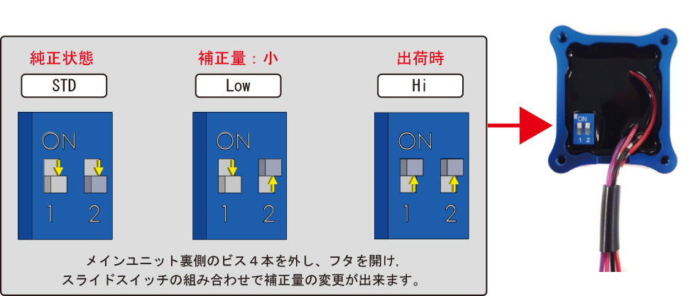 また、「EZ+plus」の燃料補正量は出荷状態では「Hi」になっているが、メインユニット裏側のビス4本を外してフタを開け、スライドスイッチの組み合わせを変えることで、燃料補正量の少ない「Low」、純正状態の「STD」に変更できる。ただし、燃料調節装置(サブコントローラー)やECU書き換えなどでO2センサーをキャンセルすると、「EZ+plus」は使用できなくなる。