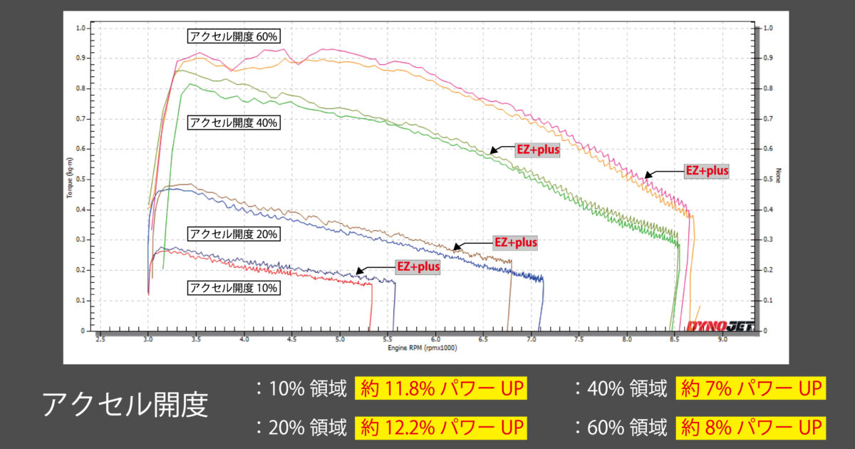グラフは「EZ+plus」装着車と未装着車のトルク発生状態を比較したもので、「EZ+plus」装着車はスロットル開けはじめの開度10%から、ハーフスロットル辺りの開度60%まで明確なトルクアップを実現しているのが分かる。とくにスロットル開度10%~20%ではノーマル(「EZ+plus」未装着車)から12%近くトルクアップを達成。市街地で多用する低回転域でトルクが太くなり、より扱いやすくなっているのだ。