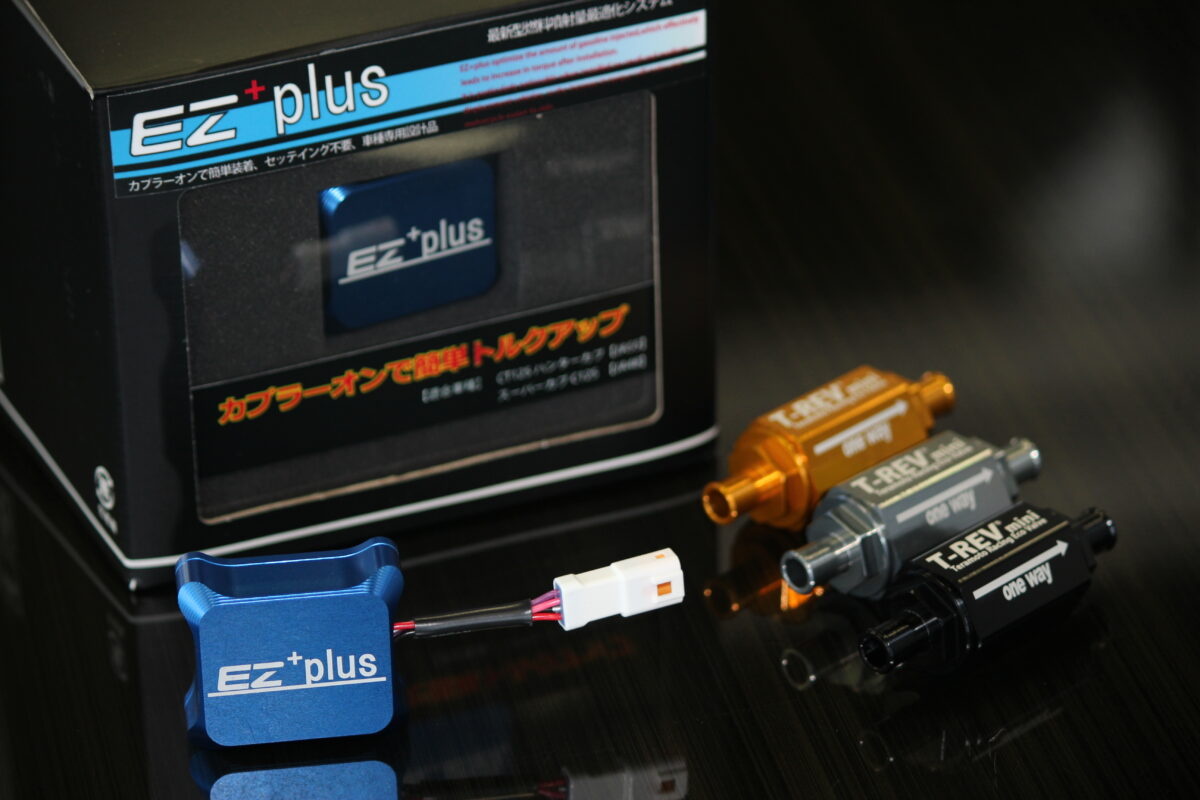 MotoMeganeでは、過去に「T-REVmini」と「EZ+plus」という二つのチューニングパーツをそれぞれ取り上げたが、今回はその二つを組み合わせるとどれぐらい効果があるのか? 普段からCT125ハンターカブ(JA55)に乗る筆者が、T-REVminiのみ装着、T-REVmini+EZ+plusの同時装着をテストしてみた。