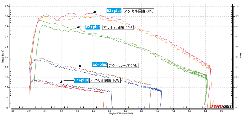 アクセル開度10%/20%/40%/60%という低中速域で、それぞれ明確なパワーUPが確認されている。