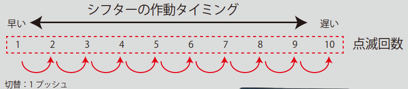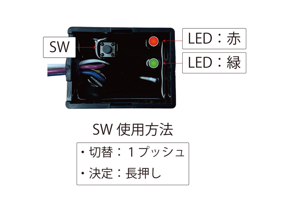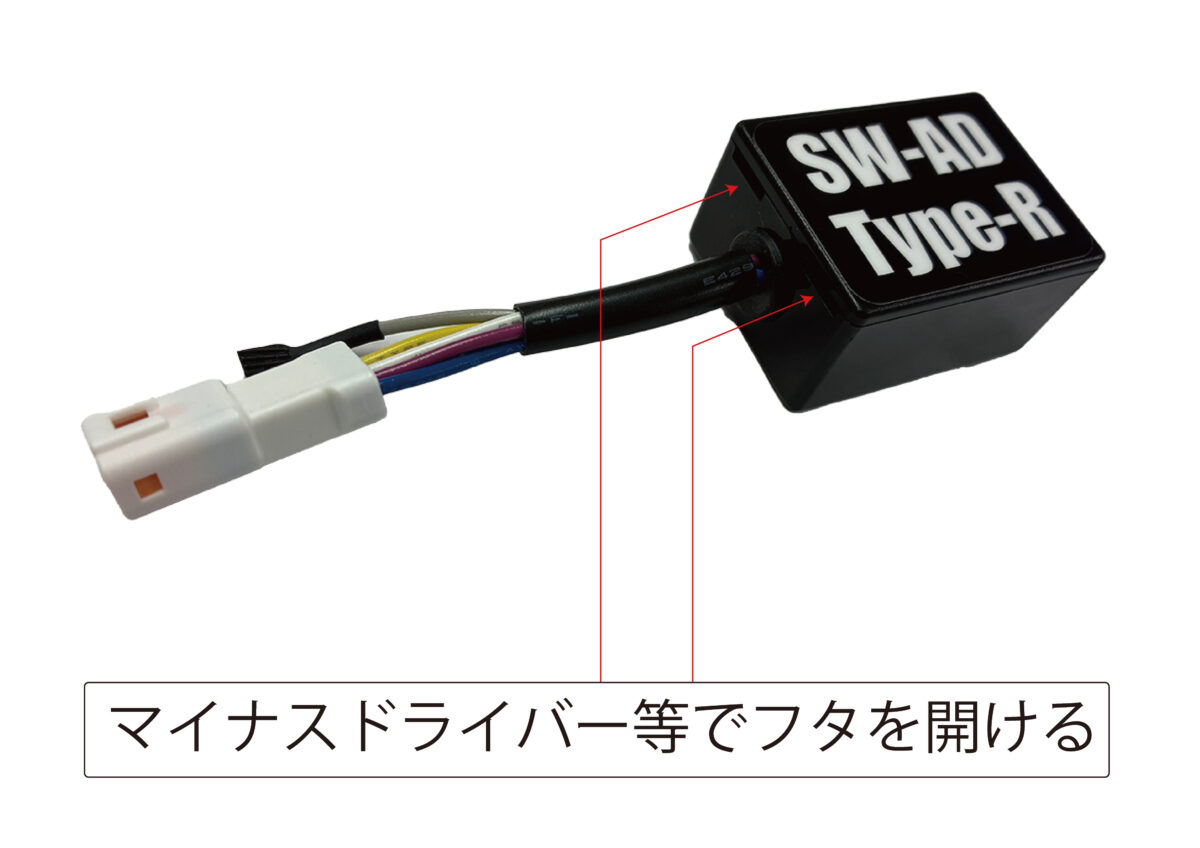 SWアダプターType-Rのフタをマイナスドライバーなどで開け、SWを1プッシュすることでシフターの作動タイミングを10段階に変更できる。赤いLEDがシフトアップ、緑のLEDがシフトダウンの表示で、点滅1回がシフターの作動タイミングがもっとも早くなり、点滅回数が増えるほどシフターの作動タイミングが遅くなっていく。
