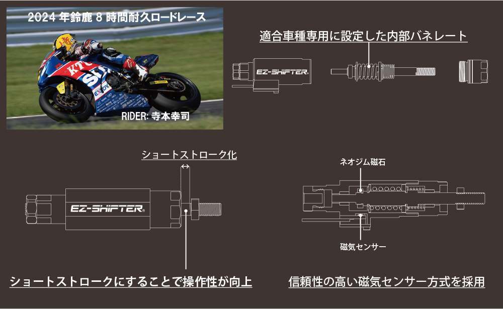 EZ-SHiFTERスイッチの内部はレースで実績のある高品質なパーツが使用されている。シフトロッドの動きはネオジム磁石を使用した磁気センサーで緻密に検知し、ショートストローク化することでシフトチェンジの操作性を向上している。