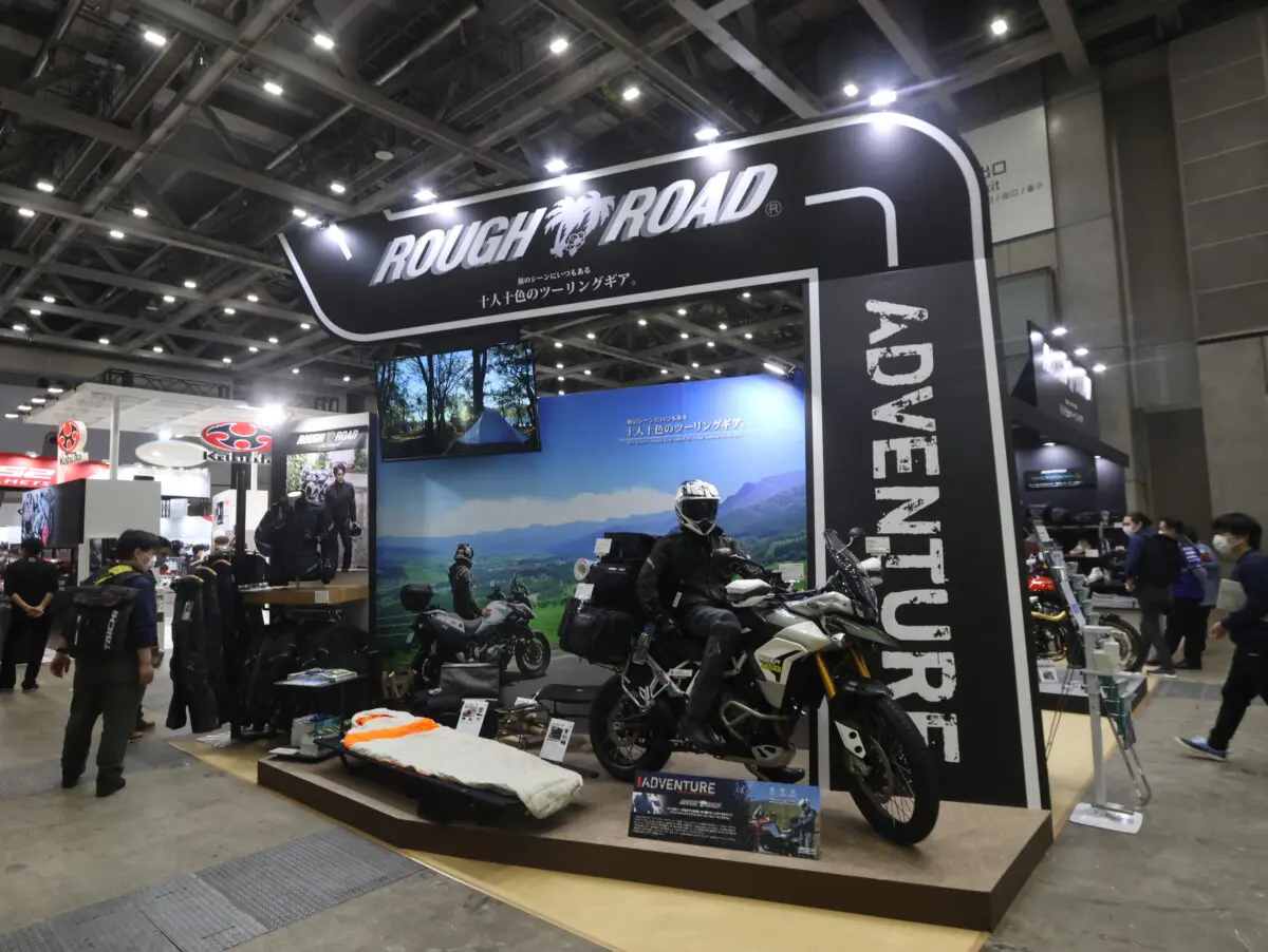 「アドベンチャー:冒険」をメインコンセプトにブースをデザイン。「ラフアンドロード」には世界一周のようなハードなツーリングに対応できるアイテムももちろんあるが、今回の第50回東京モーターサイクルショーで提案したのは、“普通のライダーが日々の生活の中でちょっとだけ新しいことに挑戦する”こと。キャンプツーリングやロングツーリングなどがその内容だが、そんな身近な「冒険」を応援する便利で快適なアイテムを多数展示して人気となっていた。