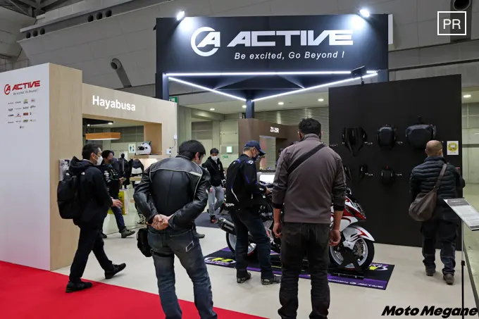 三車(者)三様のカスタムライフ提案が、今回の東京モーターサイクルショーにおけるアクティブブースのテーマ。バイクを楽しむ“ヒト”をイメージしながら、スズキ・HAYABUSA、ホンダ・GB350S、カワサキ・Ninja ZX-25Rという3タイプのショーモデルを、独立したガレージ風の空間に配置して表現。総合パーツメーカー&代理店として「走る、曲がる、止まる」をバランスよくまとめるトータルカスタム提案ができる強みを生かして、それぞれのライフスタイルを彩るカスタムパーツを車両と合わせて展示した。