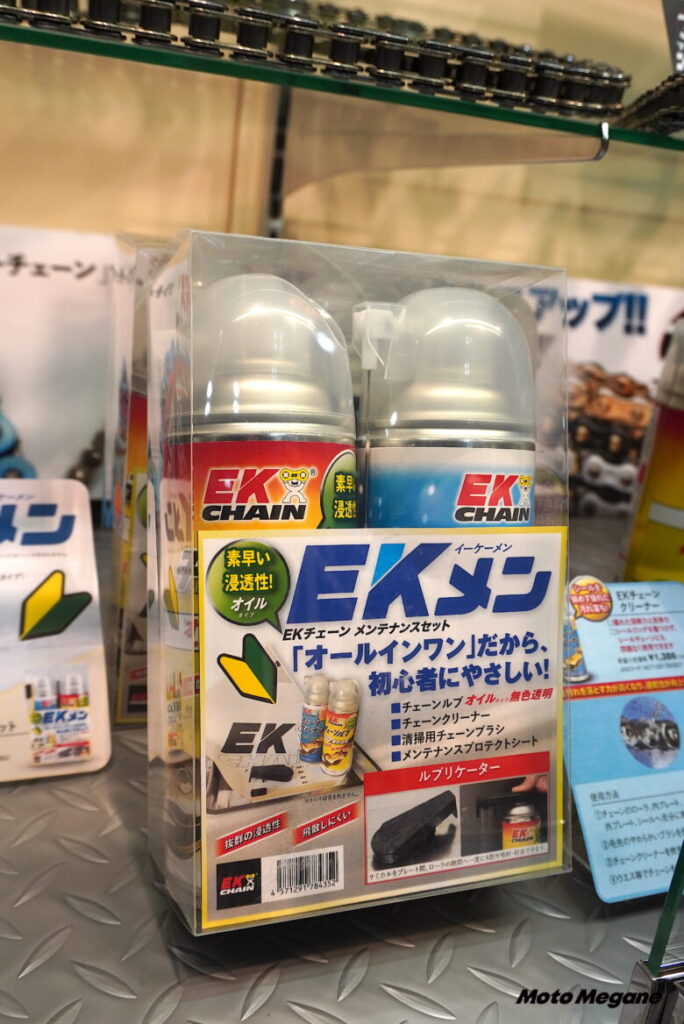 江沼チヱン製作所では、チェーンルブ、チェーンクリーナー、ルブリケーター(ルブをチェーンに効率よく吹き付けるための道具)、清掃用チェーンブラシ、メンテナンスプロテクトシートが一つにまとまった『EKメン』というメンテナンスセットが用意されている。