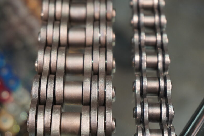 左の極太チェーンは0-400mの速さを競うドラッグレースで使用されるもの。右側の普通のバイク用チェーンがおもちゃのように見えてしまう。