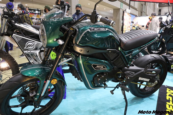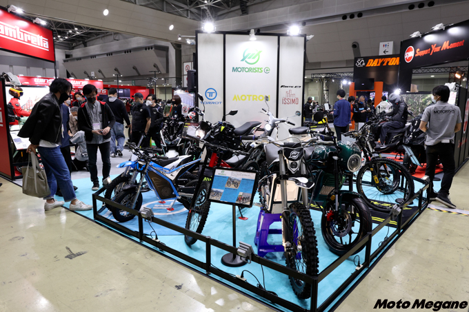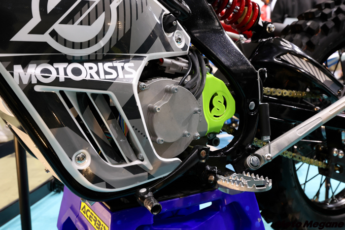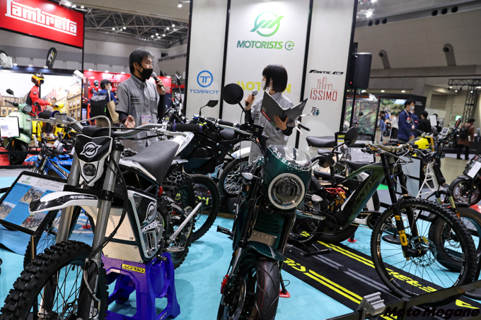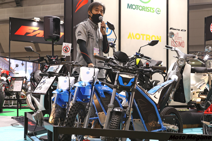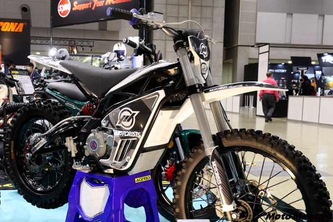 展示されたのはオフロードモデル2機種とストリートモデル1機種。いずれもモータリストが企画し、中国のパートナー企業と開発を進めて商品化させたODM(Original Design Manufacturing)モデルだ。モータリストでは、「近い将来必ず訪れる脱炭素化の波に備え、モータリストの商品を販売する販売店が商品の先細りによってビジネス機会を損失することがないように、長期的視野に立って商品の供給を検討してきた」という。