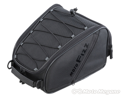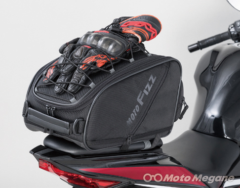 ショートツーリングや普段使いにオススメのシートバッグ。サイドフラップ内に取付バックルが隠せるので、スッキリとした取付が可能なのが特徴。大型背面ポケットをはじめ、グローブやメガネの一時置きに便利な上面バンジーコードを装備する。型崩れ防止構造を採用している。●価格:11,000円(税込)