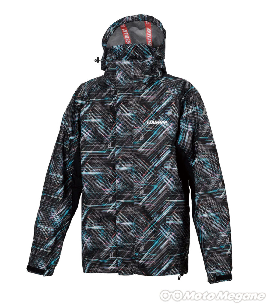 裏地による着用時の引っ掛かりがなく、ストレッチ性能が動きやすさを高める3レイヤー生地を採用。独創的なグラフィックはアウトドア等でも活躍するニューコンセプトレインスーツだ。表地はポリエステル3層構造「TPUコーティング」を採用している。耐水圧20,000㎜ 透湿性10,000g/㎡-24h
