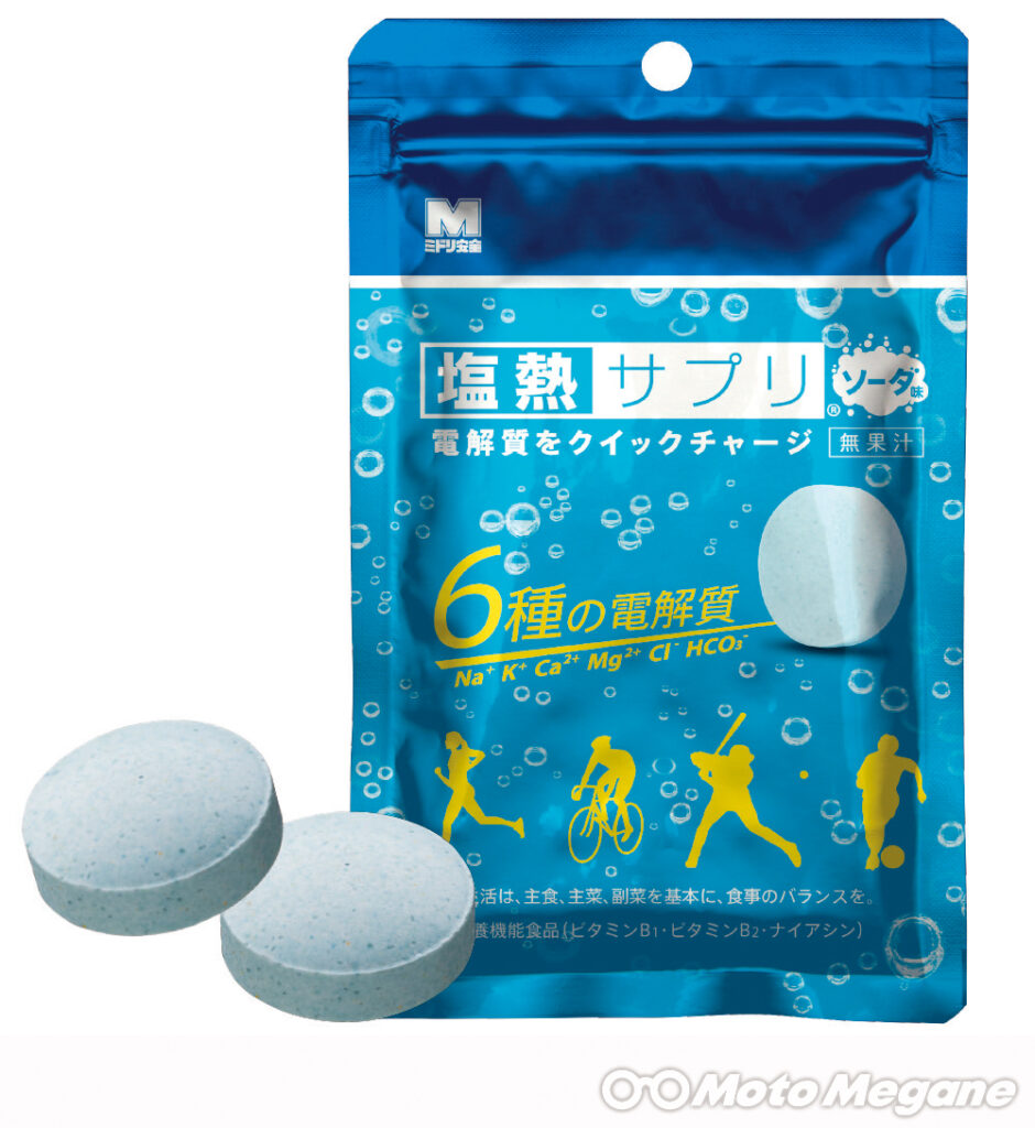 「塩熱サプリ」は電解質や栄養素を瞬時に体内に吸収。水分の吸収を高めるサプリメント。夏のライディングで消費される電解質とビタミン補給に最適なサプリだ。ツーリングの際にはバッグに一つ入れておこう。爽快なソーダ味。●価格:598円(税込)