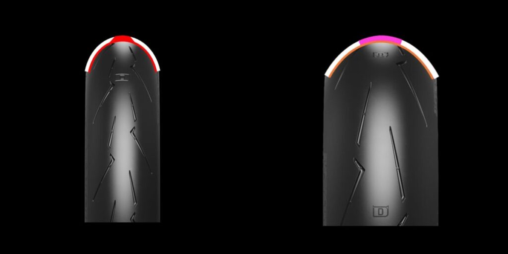 レース完全対応のDIABLO™ SUPER CORSA V4 SCよりも温度依存性が低く、ウォームアップ性が早く、耐久性にも優れるストリートからサーキットまで楽しめるDIABLO™ SUPER CORSA V4 SPも用意されていました。前後にデュアルコンパウンドを採用し、ショルダー部分はSC3コンパウンドとなっています。スーパーコルサらしさは残しつつ、プロファイルやトレッドパターンをV3から刷新し、内部構造も別物です。