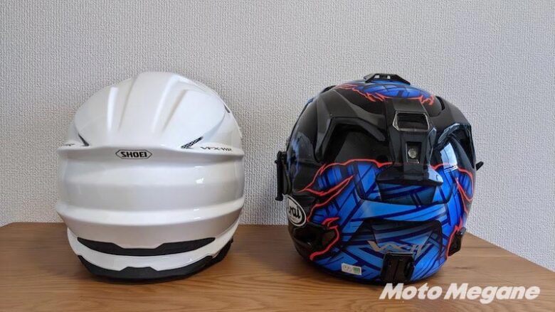Araiは丸みがあり、SHOEIは複雑な形状です。