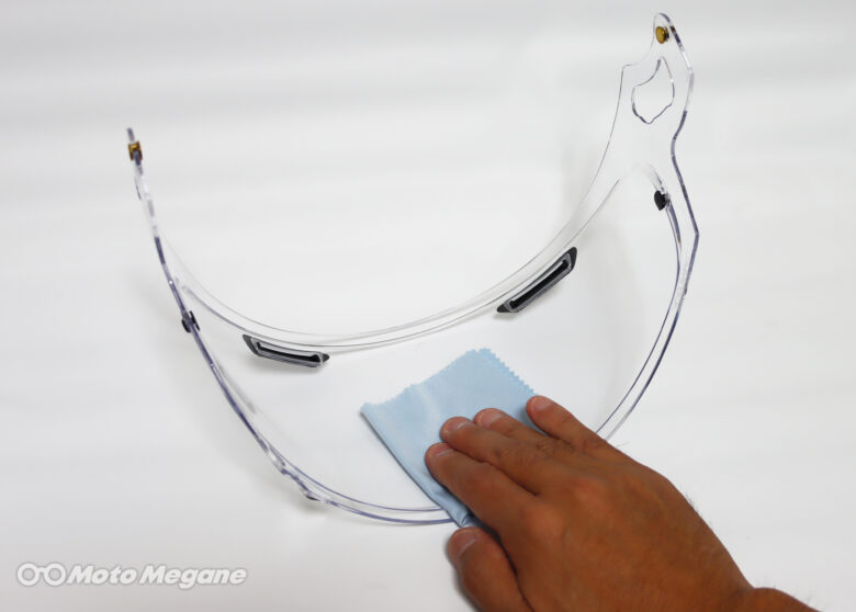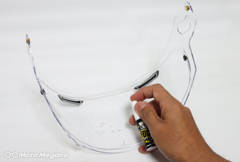シールドの内側にシュッとひと吹きし、柔らかい布で拭きあげるだけでOK。メガネも同じ要領で塗ればOKだ。