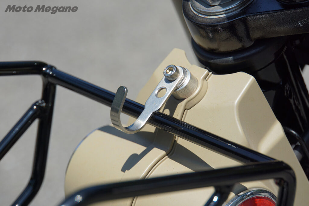 教習所でニーグリップの大切さを教わった人は多いと思うが、スーパーカブなどのアンダーボーンモデルはガソリンタンクがシート下にあるのでそのままではニーグリップができない。しかしセンターバスケットを装着することでニーグリップが可能になるのである。