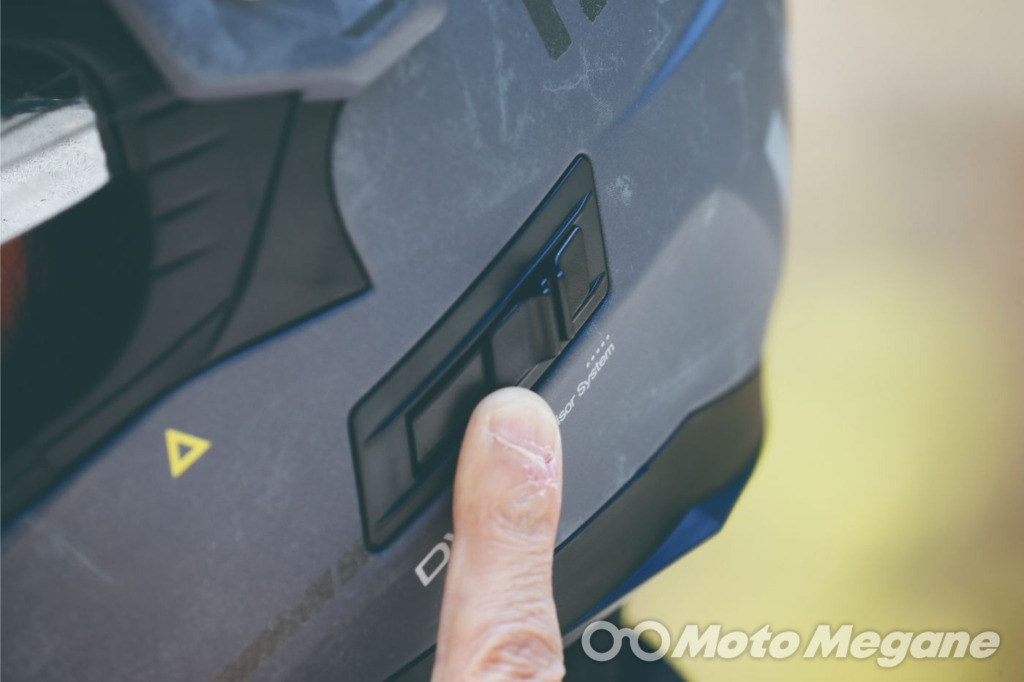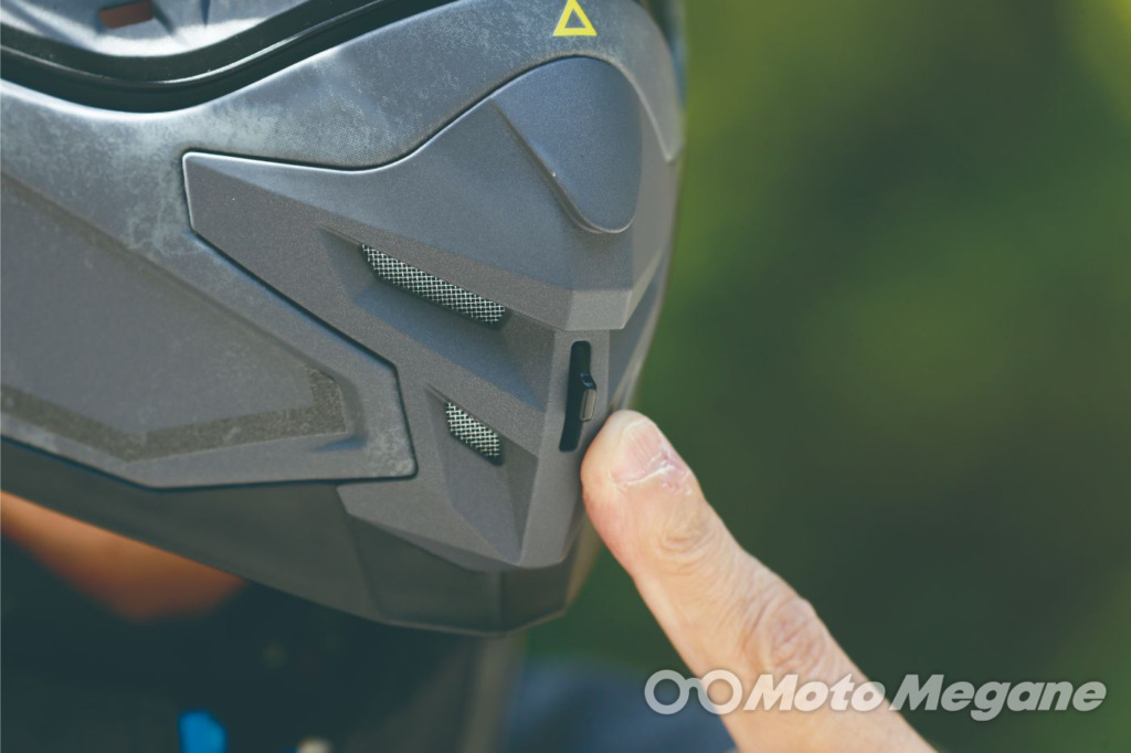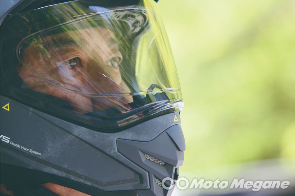 標準でトレイルスタイル、バイザーを外せばフルフェイス・ストリートスタイル、シールドを外しゴーグルを装着すればモトクロススタイルへとスタイルチェンジが可能だ。バイザーの脱着はコイン1枚あれば簡単にできる。