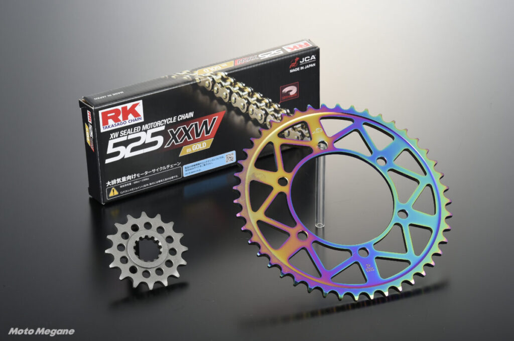 そしてドライブチェーンにはRK製のハイエンドモデルXXWシリーズ。フロントスプロケットは実績のあるクロムモリブデン綱製。これら3点がセットになっている。